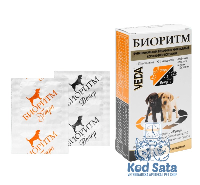 BIORITAM je funkcionalni dodatak ishrani nove generacije za odrasle pse do 10 kg. Sadrži potpuno iskoristive oblike vitamina i mikroelemenata podeljene u dva unosa (jutro/veče), koji pokrivaju dnevne potrebe bez obzira na vrstu ishrane. Režim dvostrukog unosa može da poveća efikasnost vitaminske profilakse za 30–50%.