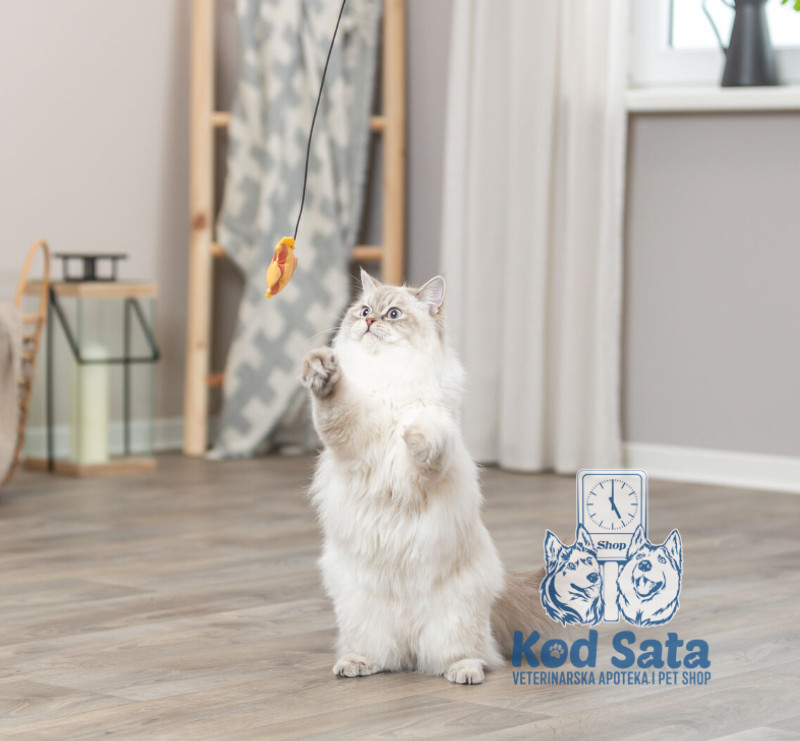 Trixie pecaljka za mačke sa plišanom ribom dužine 46 cm predstavlja zabavnu i interaktivnu igračku koja podstiče prirodni lovački instinkt kod mačaka. Plišana ribica na kraju kanapa imitira plen i svojim pokretima privlači pažnju, motivišući mačku da juri, skače i hvata.